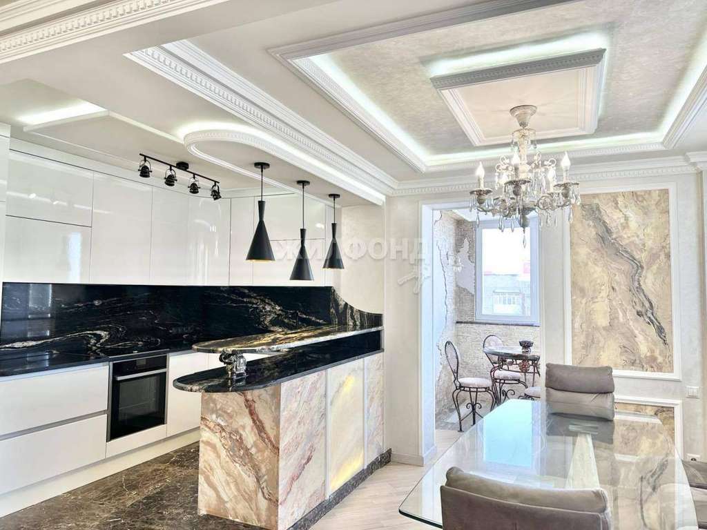 - Ремонт выполнен исключительно из натуральных материалов премиум-класса: паркет, мрамор(включая подоконники по всей квартире, подиум в зоне приготовления пищи, камин) , природный гранит(столешница и фартук, барная стойка) , вставки из оникса на стене за кинотеатром и в барной стойке.
