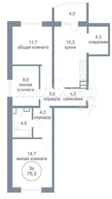Продается трехкомнатная квартира в новом доме. Класс энергоэффективности дома А и А+. Общая площадь квартиры составляет 75,3 кв. м.