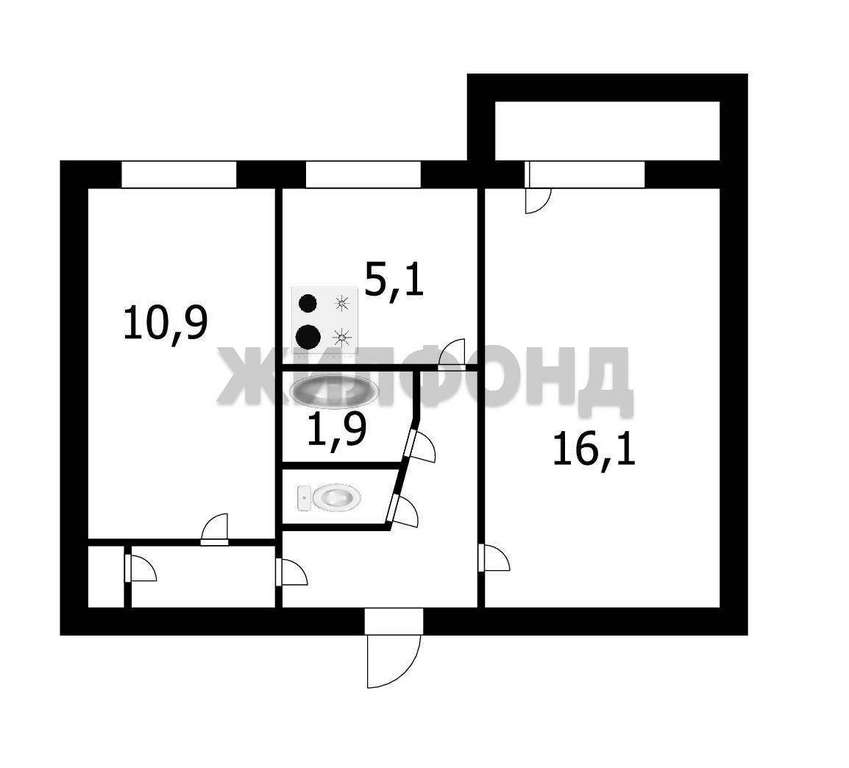 Кухня - 5,1 м2. Комнаты -16,1 м2; 10,9 м2.